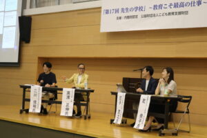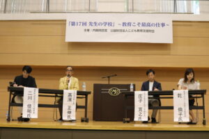 今年度は、花まる学習会代表、高濱正伸先生を講師としてお招きし、高濱先生以外にも庄子 寛之先生(ベネッセ教育総合研究所主任研究員)、乾 倫子先生(香里ヌヴェール学院小学校専任教諭)、 二川 佳祐先生(練馬区石神井台小学校教員)をパネリストとして迎え、「教育ほど素晴らしい仕事はない」というテーマで講演をしていただきました。